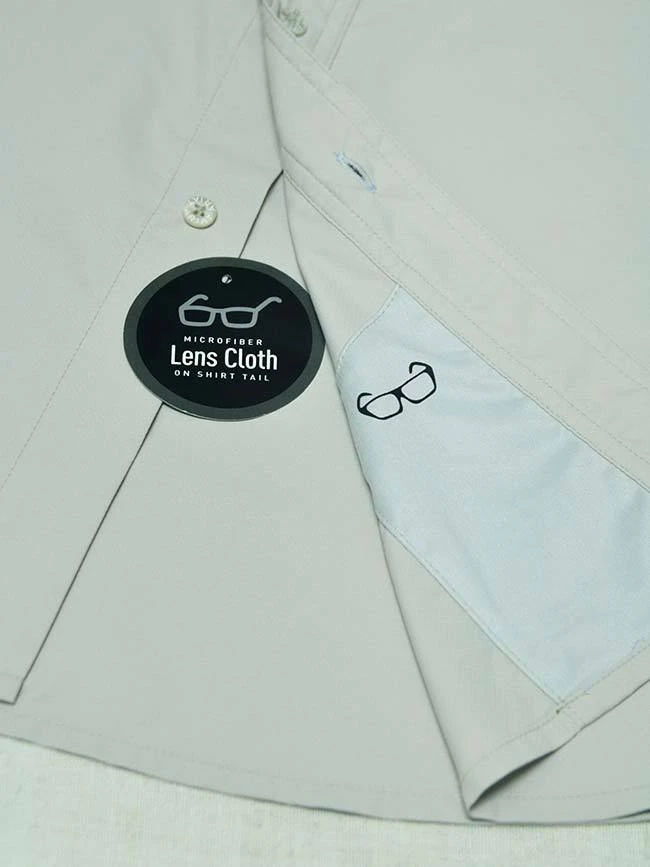 - Hidden microfiber lens cloth on shirt tail.